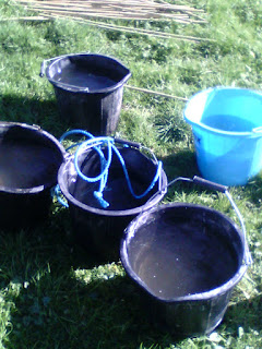 The orchard does not have a mains water supply, but we do have a river at one end. The process has been to chuck in a bucket attached to a rope and haul out a bucket of water and tip it into a builder's trough. The volunteers doing the watering take water from the trough.
